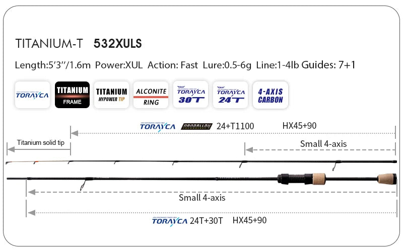 Construída em carbono de alto módulo, a Titanium-T combina ação Fast com potência ultralight (1–6 lb), garantindo fisgadas rápidas e controle absoluto da isca. Seu corpo leve e responsivo transmite cada vibração da linha, permitindo detectar até os ataques mais sutis.